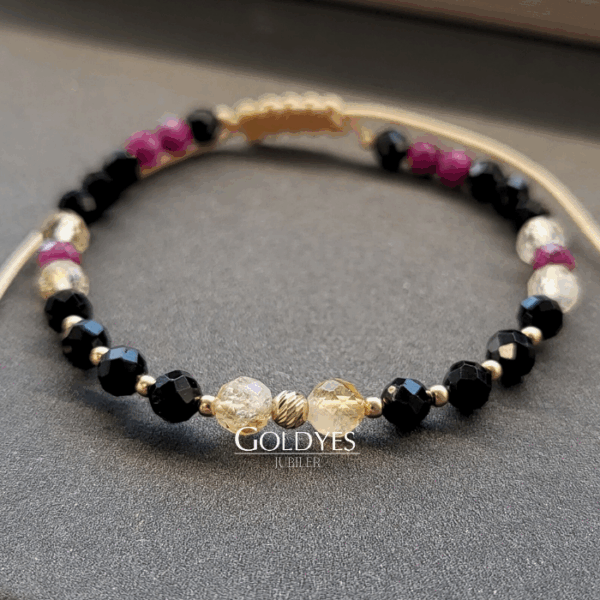 złota bransoletka na złotym sznurku z czarnym turmalinem i diamentowanymi kulkami próba złota 585