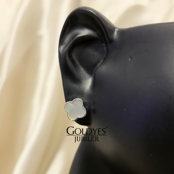 Srebrne kolczyki z koniczyną i masą perłową, wykonane z próby 925. Delikatny design z białymi akcentami, idealny na wiele okazji.