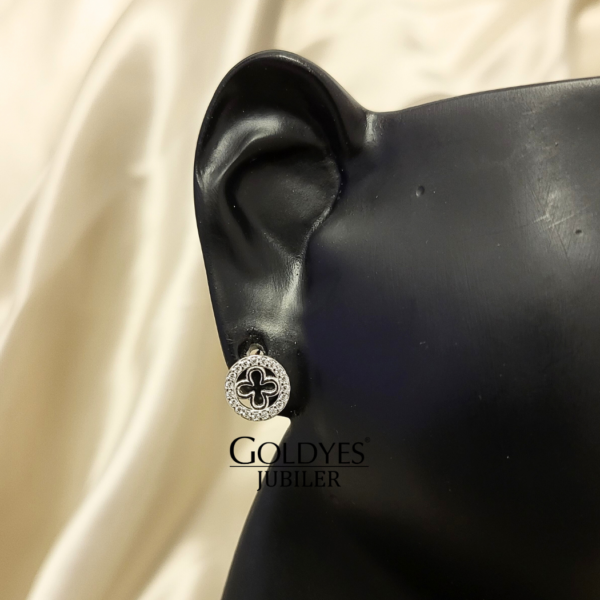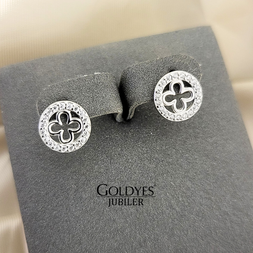 Srebrne kolczyki z koniczyna z cyrkoniami. Delikatny design z białymi akcentami, idealny na wiele okazji.