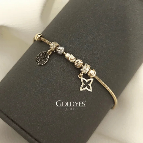 Złota bransoletka klasyczna damska szeroka o splocie linka z zawieszkami