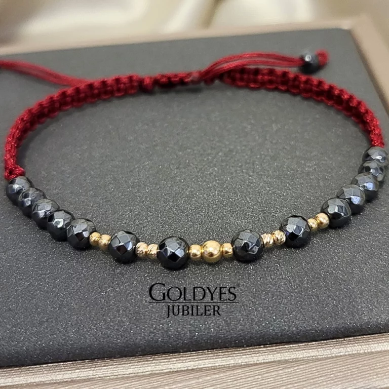 Złota bransoletka na sznurku z diamentowanymi i gładkimi kuleczkami