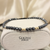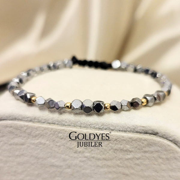 Złota bransoletka na czarnym sznureczku z diamentowanymi kuleczkami kamień hematyt srebrny