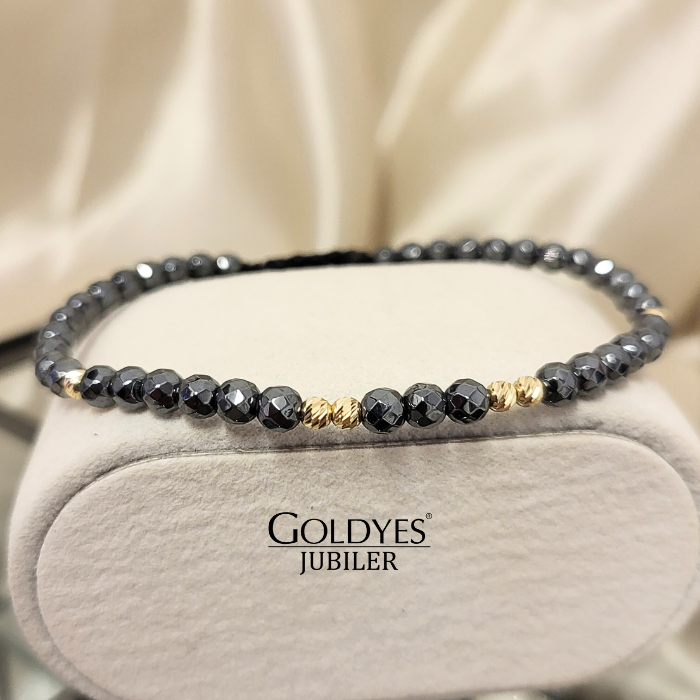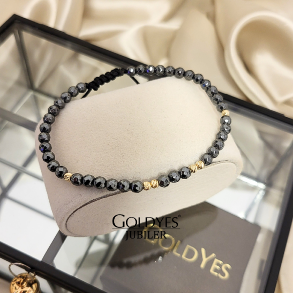 Złota bransoletka na sznureczku z diamentowanymi kuleczkami
