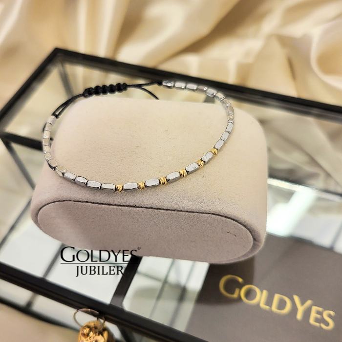 Złota bransoletka na czarnym sznureczku z diamentowanymi kuleczkami i hematytami