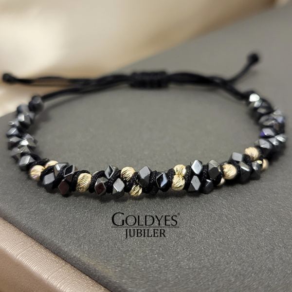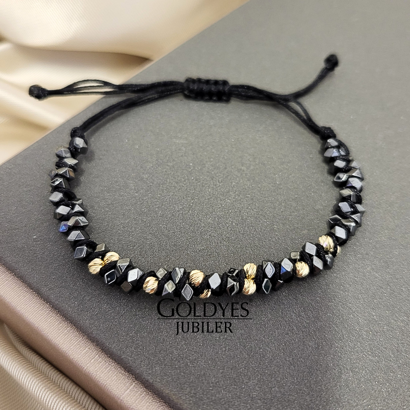 Złota bransoletka na czarnym sznureczku – próba złota 585, złocone kuleczki. Stanowi elegancką i subtelna ozdobę na nadgarstek. Idealna na co dzień lub na specjalne okazje.
