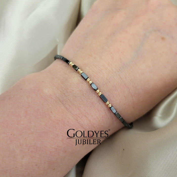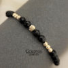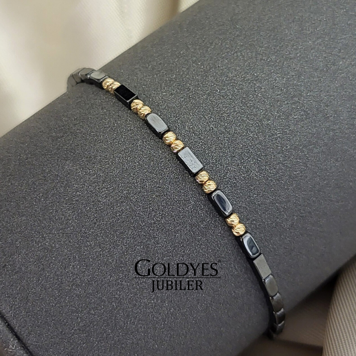 złota bransoletka na czarnym sznureczku z diamentowanymi kulkami próba złota 585