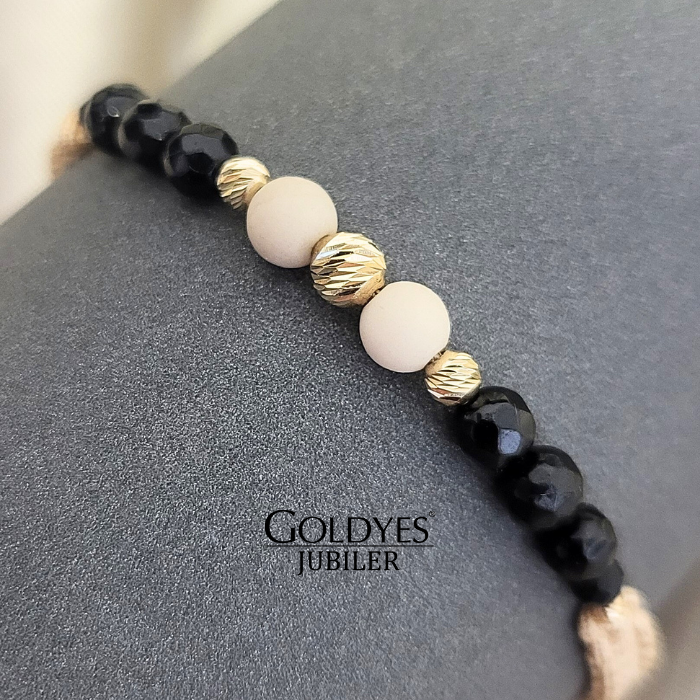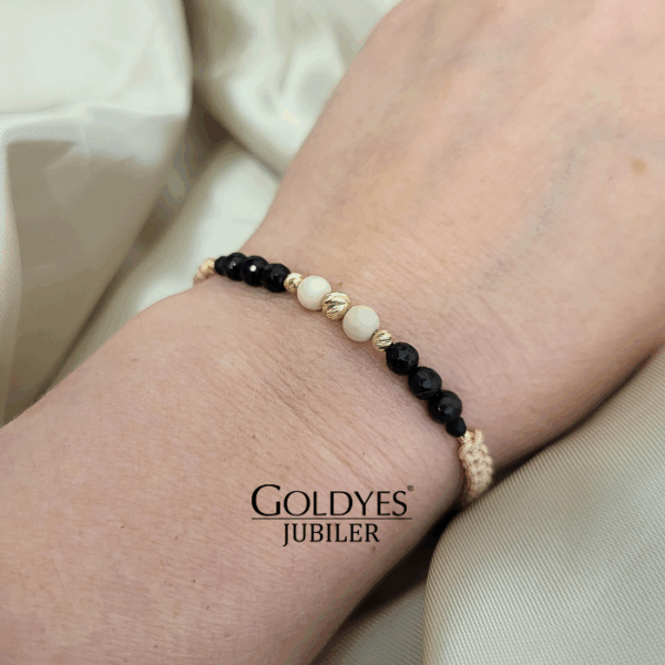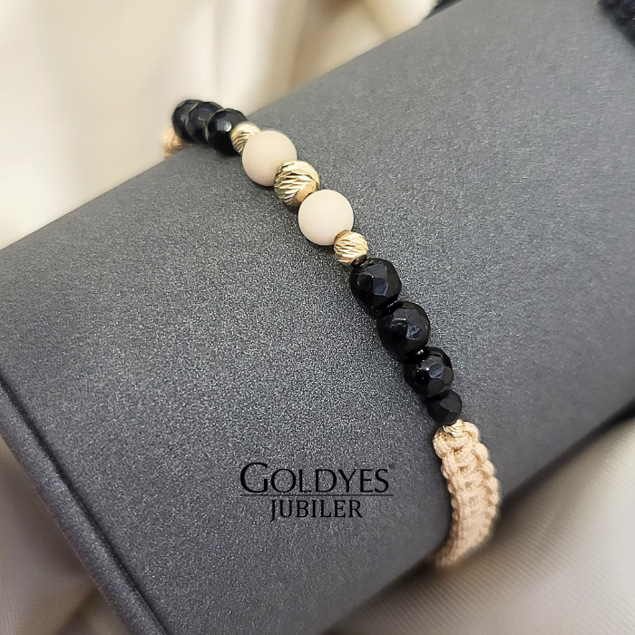 Złota bransoletka na sznurku z kulkami diamentowanymi, próba 585. Doskonała biżuteria dla kobiet ceniących elegancki i subtelny design. Kolor złoty dodaje wyjątkowego uroku i charakteru. Idealna propozycja dla osób poszukujących unikalnego dodatku do swojego stroju.