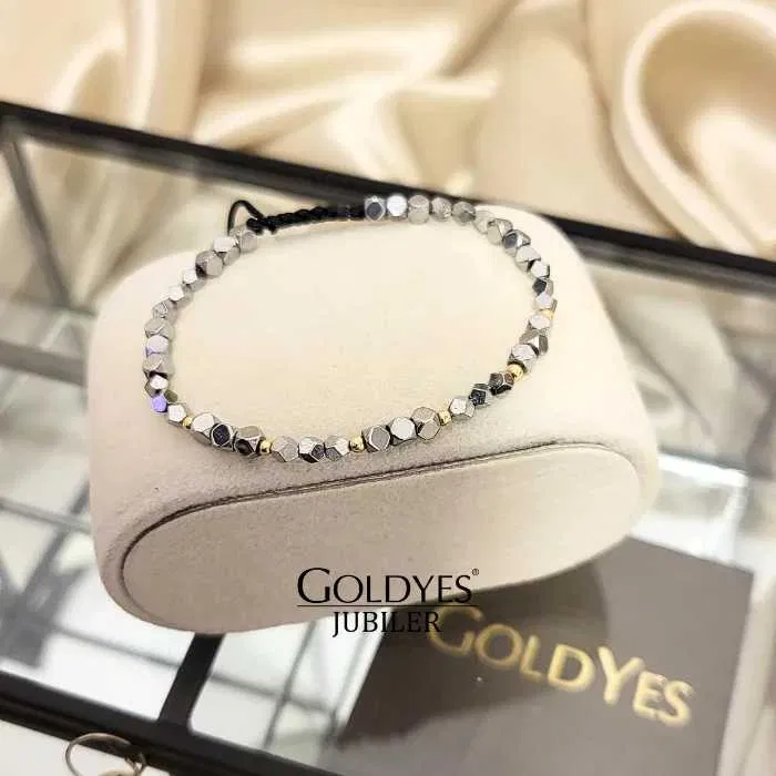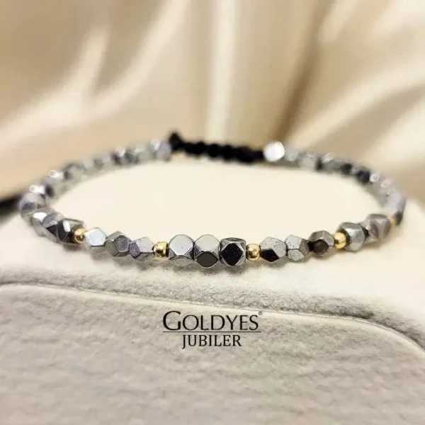 Złota bransoletka na czarnym sznurku z naturalnym kamieniem hematytu, wykończona srebrnymi elementami o próbie 585. Idealna dla kobiet lubiących subtelne dodatki w srebrnym kolorze.