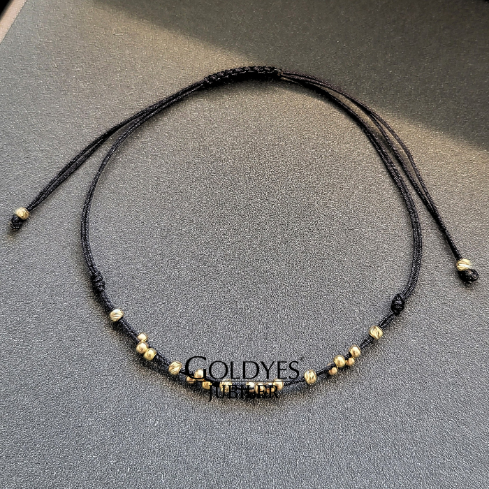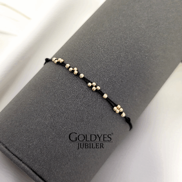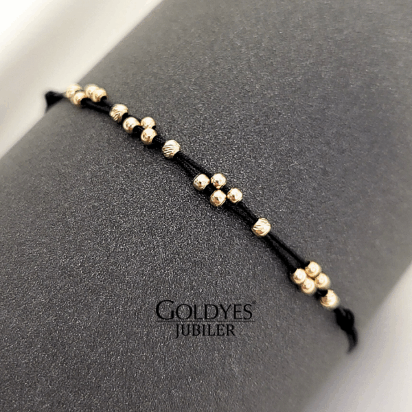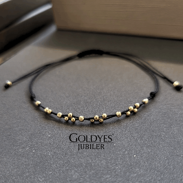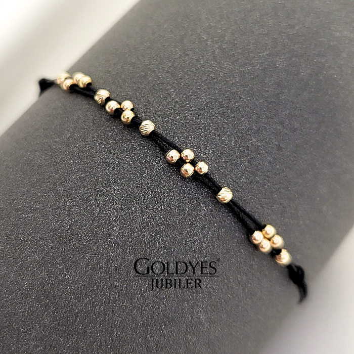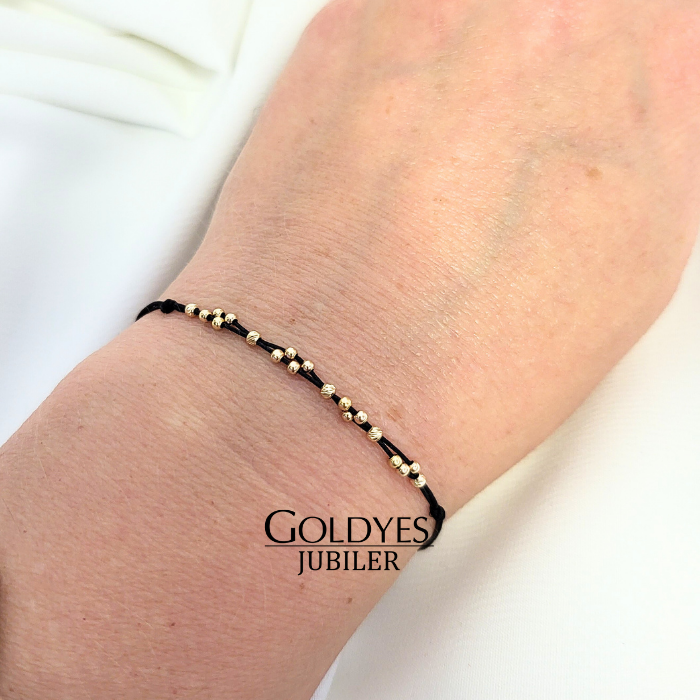 Złota bransoletka na sznurku z kulkami diamentowanymi, próba 585. Doskonała biżuteria dla kobiet ceniących elegancki i subtelny design. Kolor złoty dodaje wyjątkowego uroku i charakteru. Idealna propozycja dla osób poszukujących unikalnego dodatku do swojego stroju.