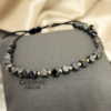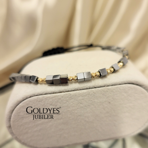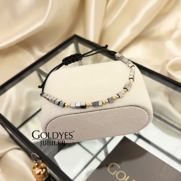 Złota bransoletka na sznureczku z diamentowanymi kuleczkami i hematytami