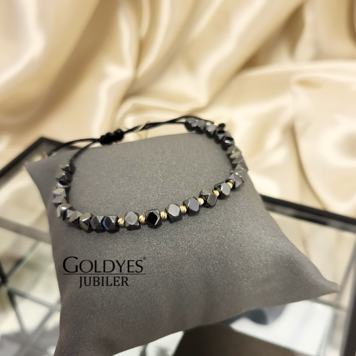 Złota bransoletka na sznureczku z diamentowanymi kuleczkami i hematytami
