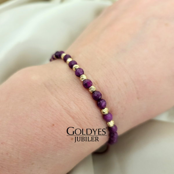 Złota bransoletka na sznurku z rubinami i kulkami diamentowanymi, próba 585. Doskonała biżuteria dla kobiet ceniących elegancki i subtelny design. Kolor bordowy dodaje wyjątkowego uroku i charakteru. Idealna propozycja dla osób poszukujących unikalnego dodatku do swojego stroju.