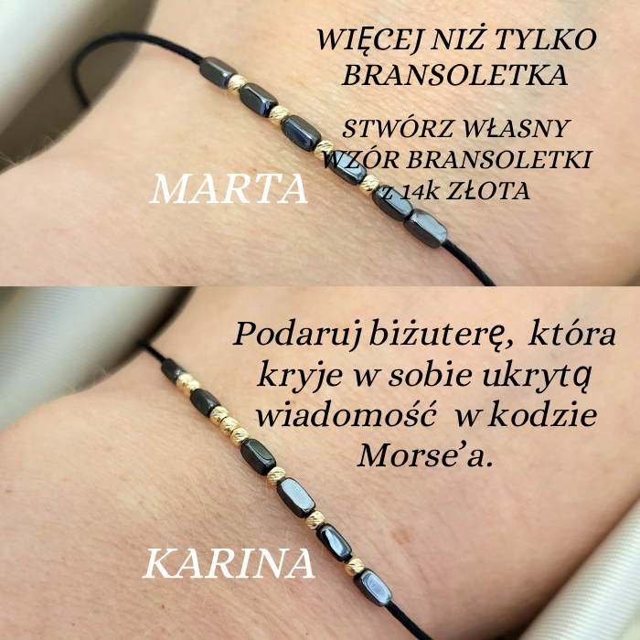 Złota bransoletka na sznurku z naturalnymi kamieniami i diamentowanymi kuleczkami ( SŁOWA ZAPISANE W KODZIE MORSE’A )