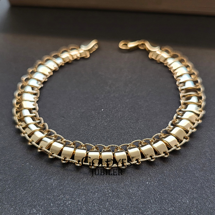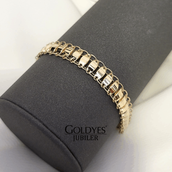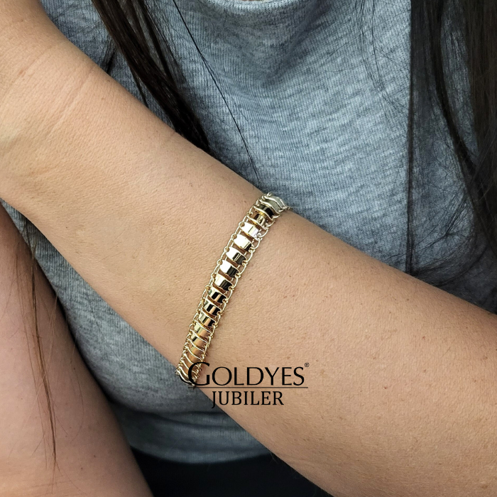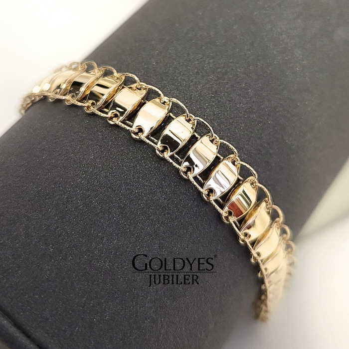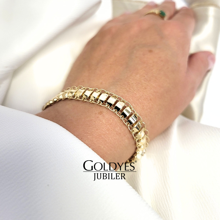 Złota bransoletka szeroka wykonana z próby złota 375. Idealna dla kobiet, prezentująca się elegancko na nadgarstku. Doskonały dodatek do każdej stylizacji, nadający subtelny i luksusowy akcent.
