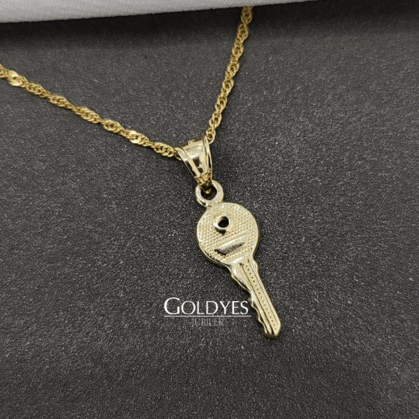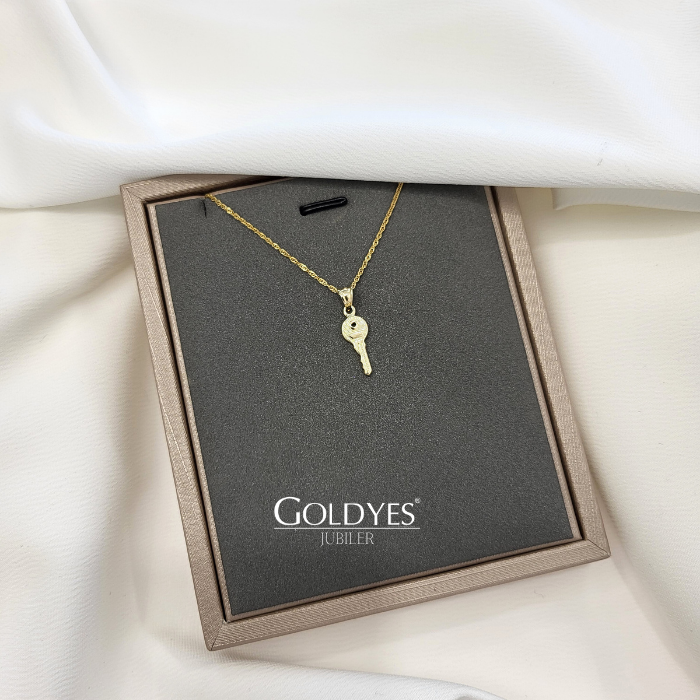 Złota zawieszka kluczyk wykonana z próby złota 585. Idealna ozdoba dla osób ceniących subtelny i elegancki design.