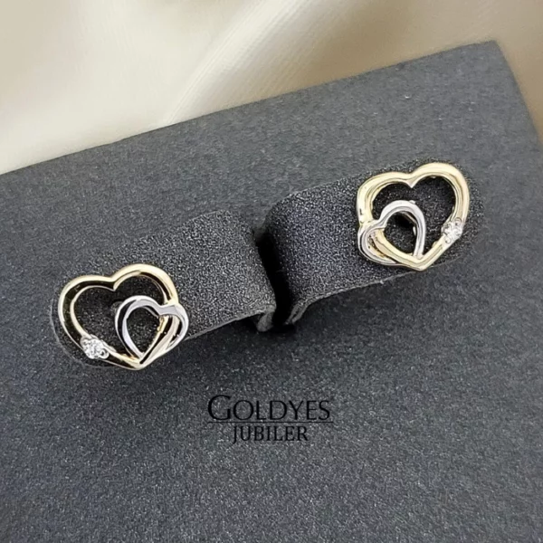 Złote kolczyki damskie SERCA Z CYRKONIAMI dwukolorowe