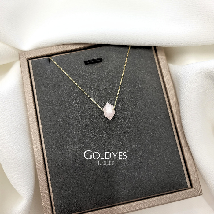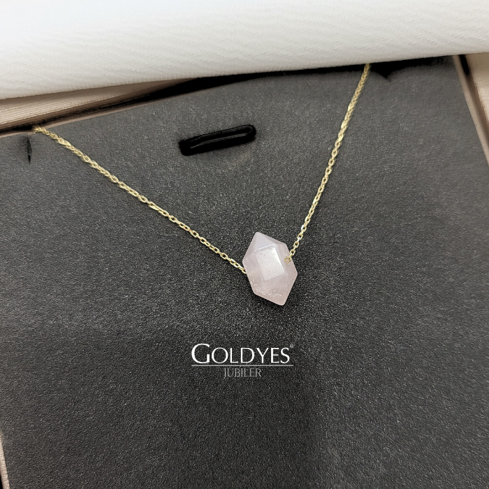 Złoty damski łańcuszek naszyjnik delikatny z naturalnym kamieniem KWARC RÓŻOWY
