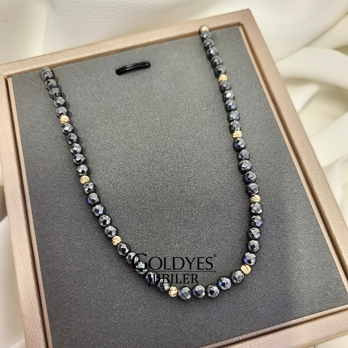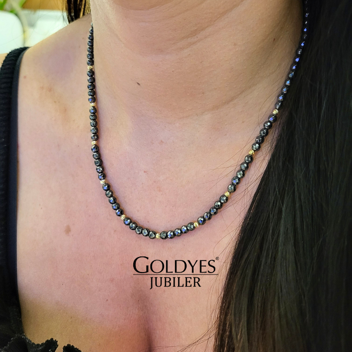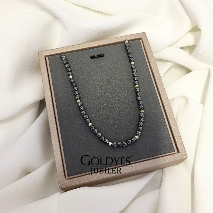 Złoty łańcuszek na czarnym sznurku, dekorowany hematytem i złotymi kulkami. Wykonany z próby złota 585 (14k). Idealny dodatek dla kobiet.