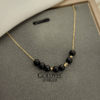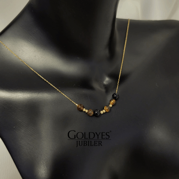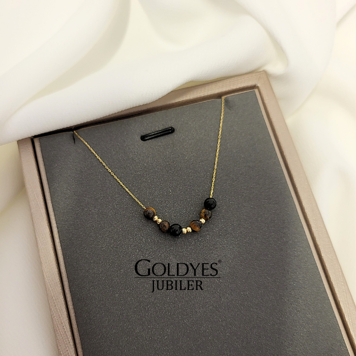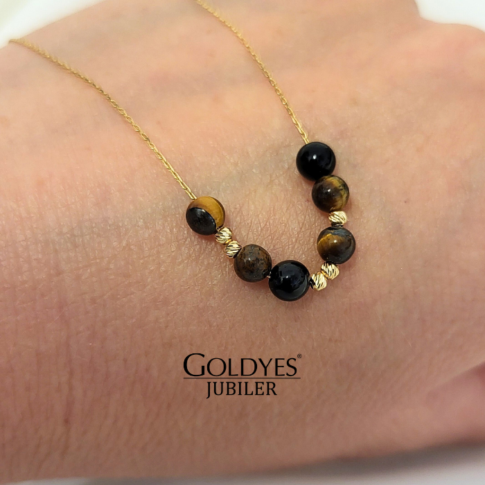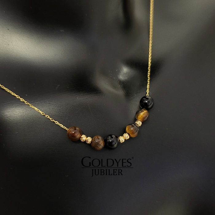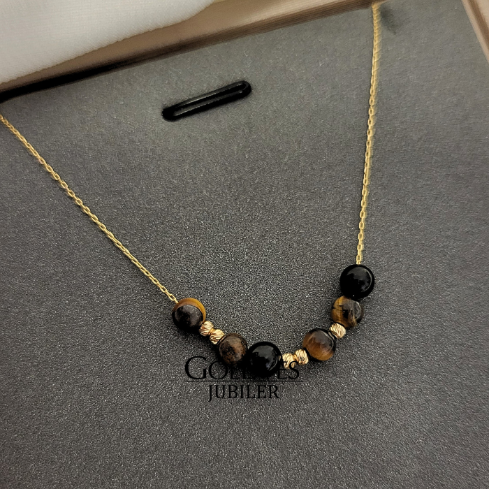 Złoty naszyjnik łańcuszek celebrytka tygrysie oko czarny turmalin i diamentowanymi kulkami
