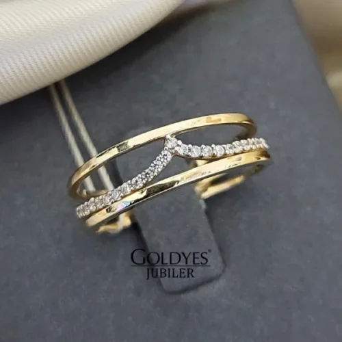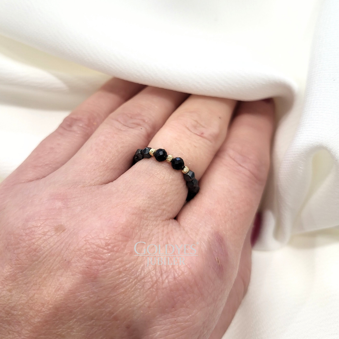 złoty pierścionek z naturalnym czarnym turmalinem i hematytem diamentowane kulkami próby złota 585